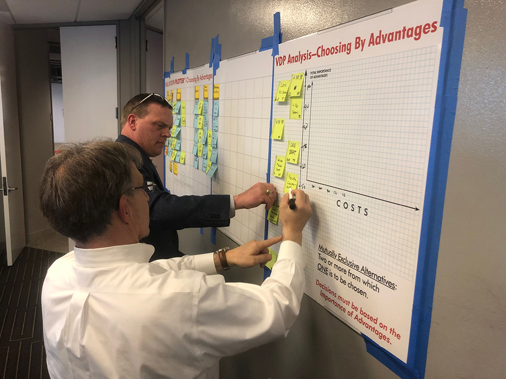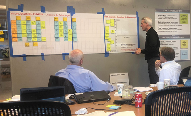 Core lean principles are activated across the VDP method/platform: visual management; reduce wastes; identify value; standardize; respect. The logic of Choosing By Advantages is embedded within the Visual Decision Plotter® decision-making method.