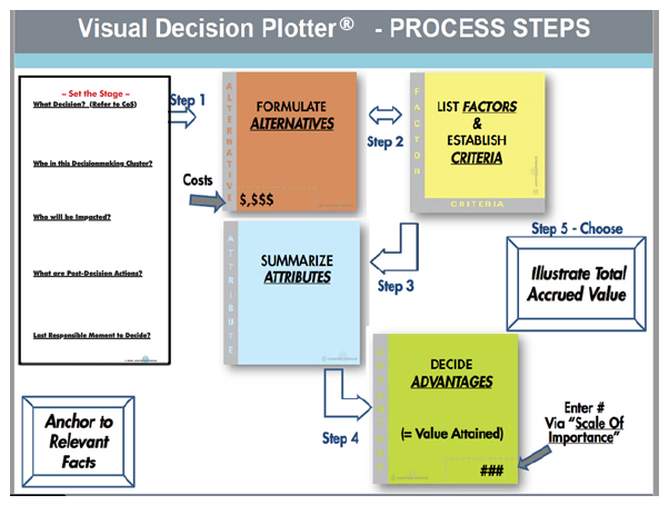 The Visual Decision Plotter® sharpens thinking from the reveal of value the customer deems important. We simplify & expedite deciding by choosing from clear and simple VDP illustrations of the accrued gains for each option being considered.