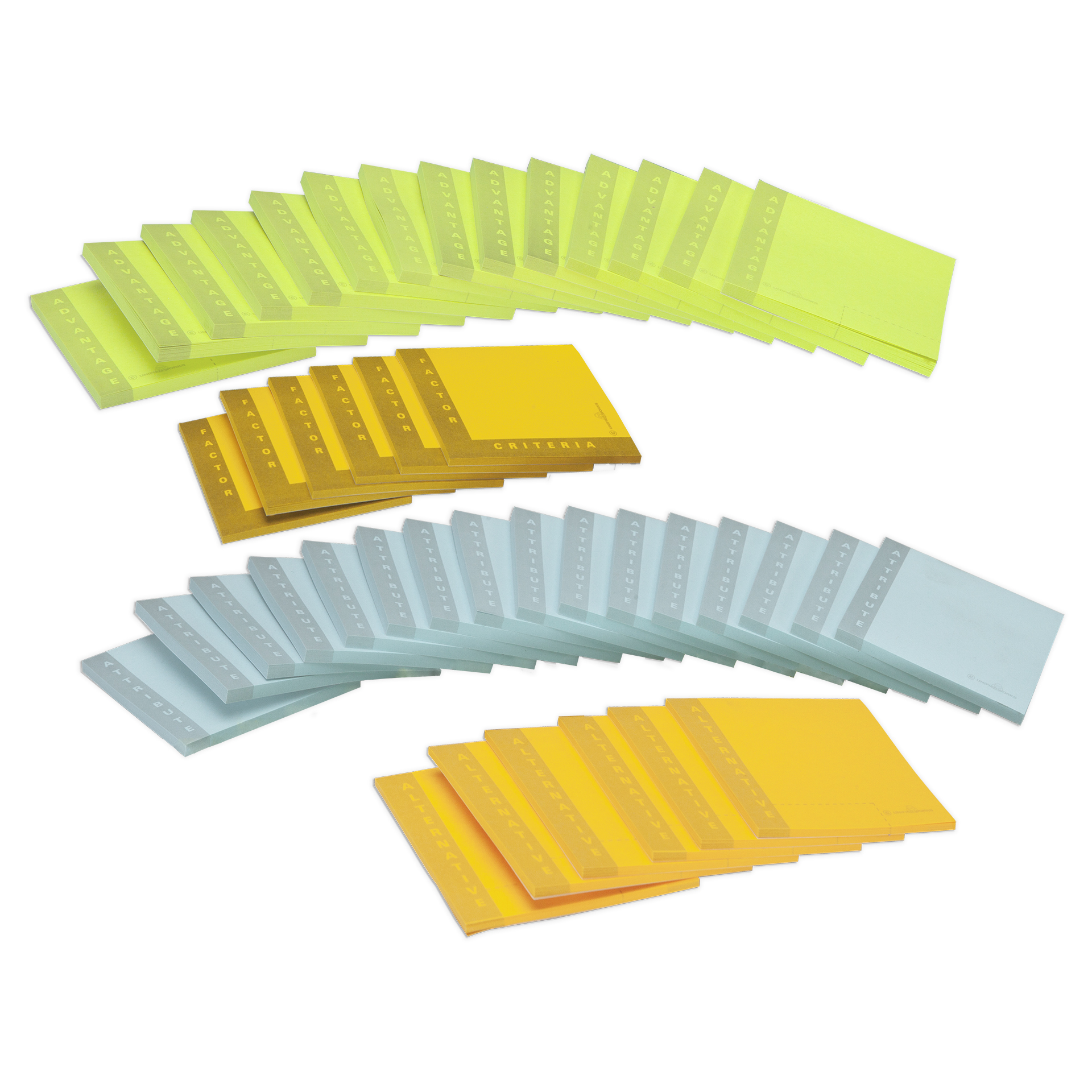 - Refill Set of Color-coded & Custom Pre-printed Sticky pads — “Alternative”, “Attribute”, “Advantage”, and “Factor & Criteria”